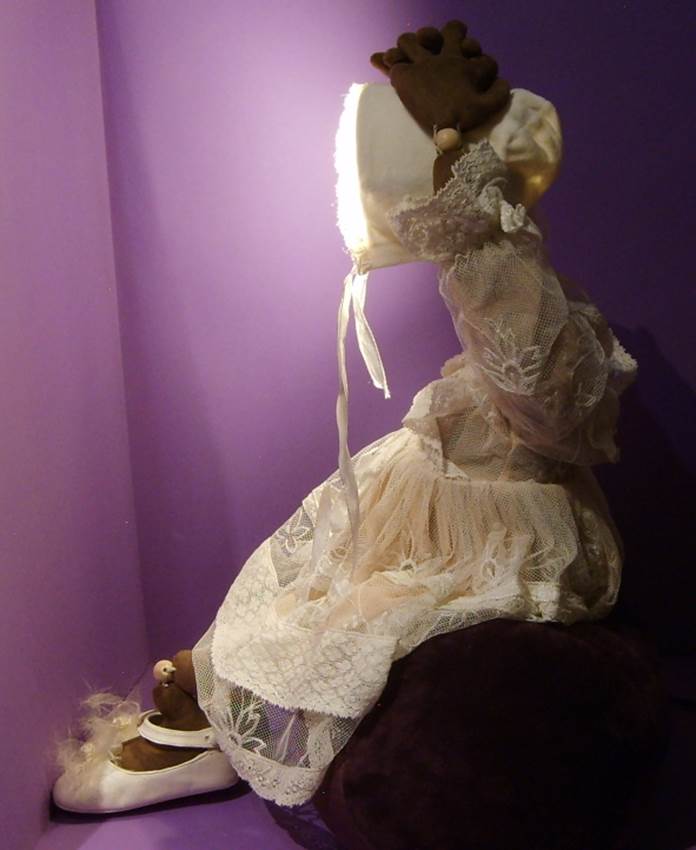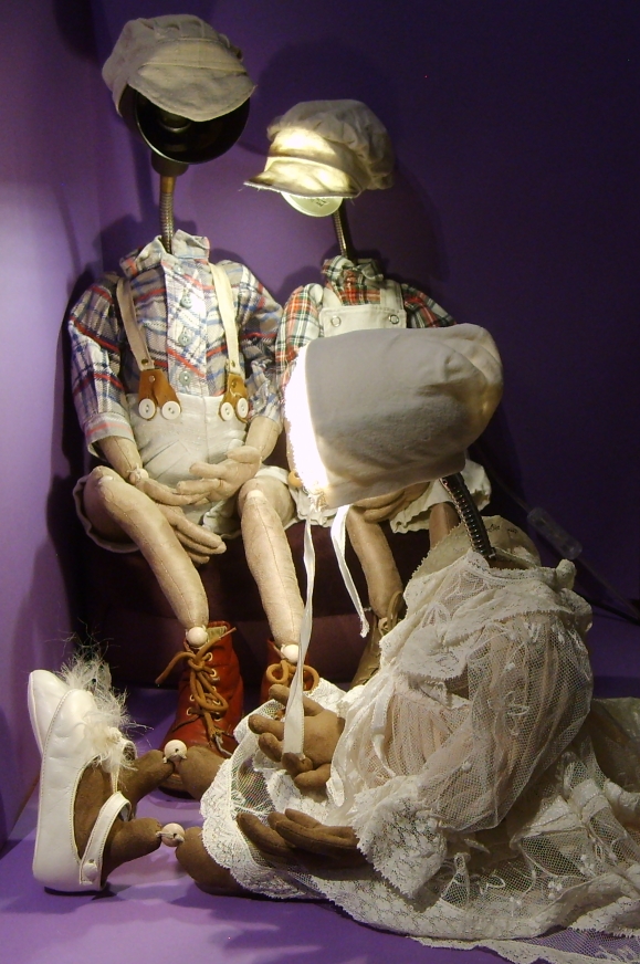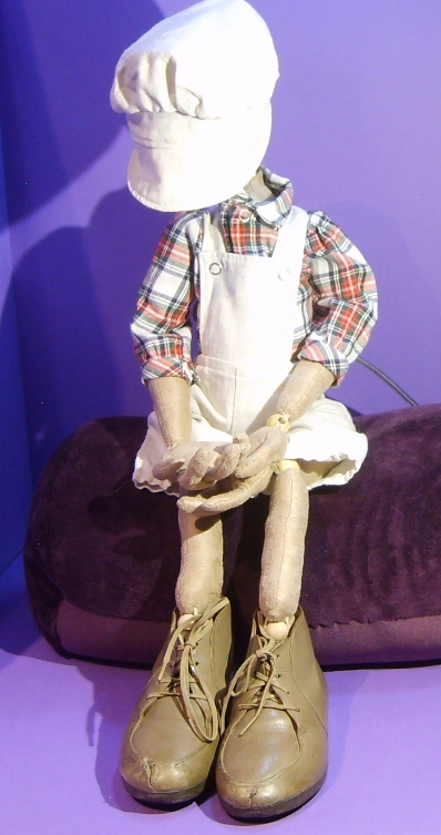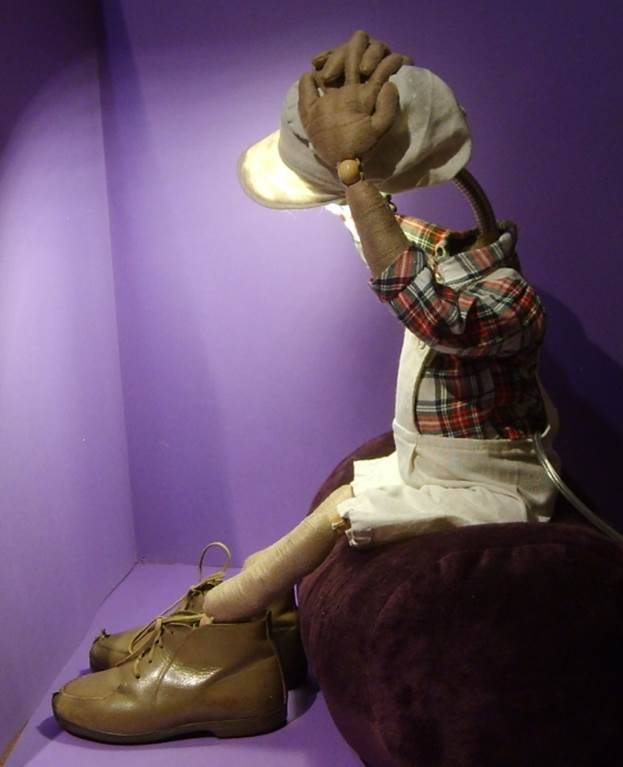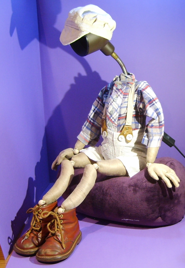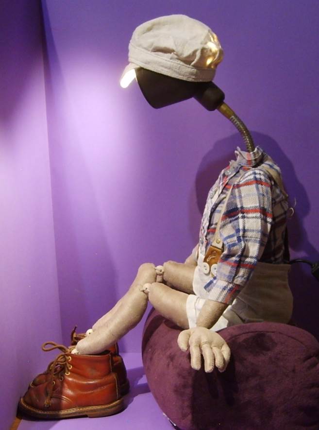 Puppenlatzhose und Hemd, alte Kinderschuhe, Drahteinlagen in den Fingern und „Lampenschirm“ Mütze |