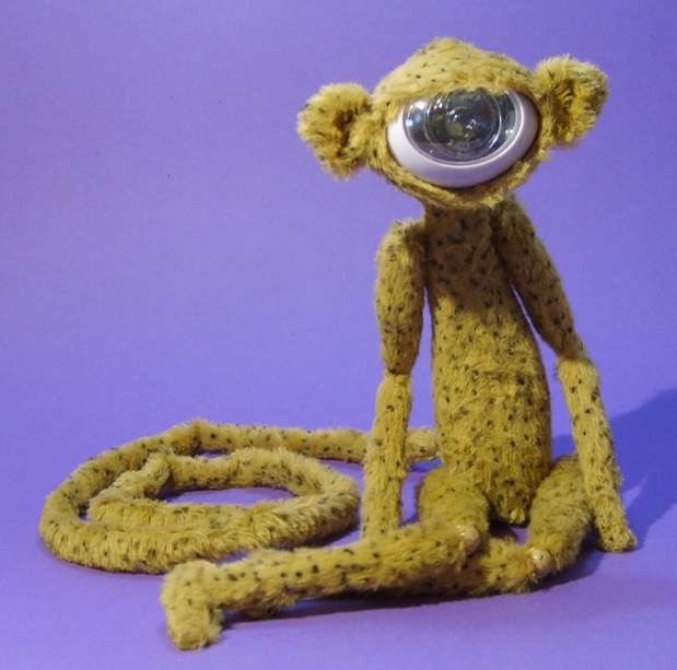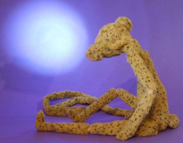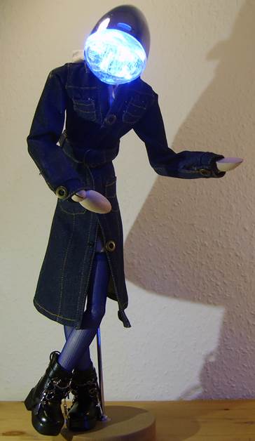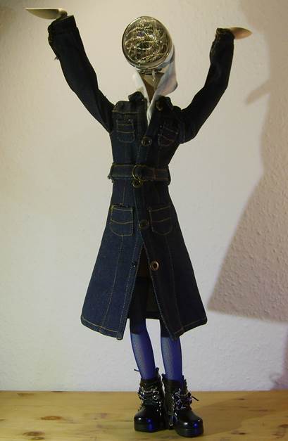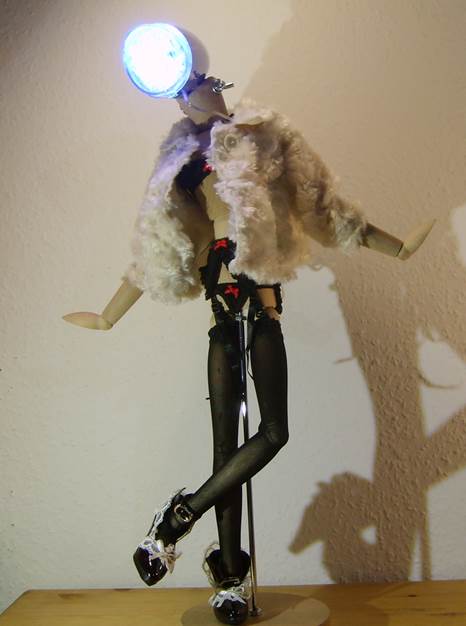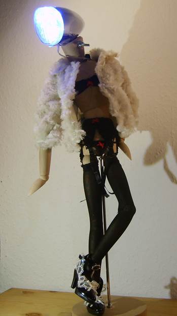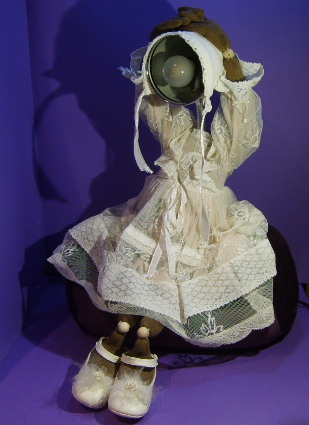 Puppenhose und Hemd, alte Kinderschuhe, Drahteinlagen in den Fingern und „Lampenschirm“ Mütze |
